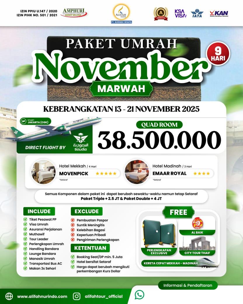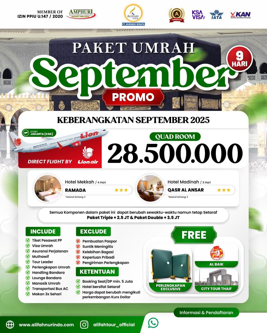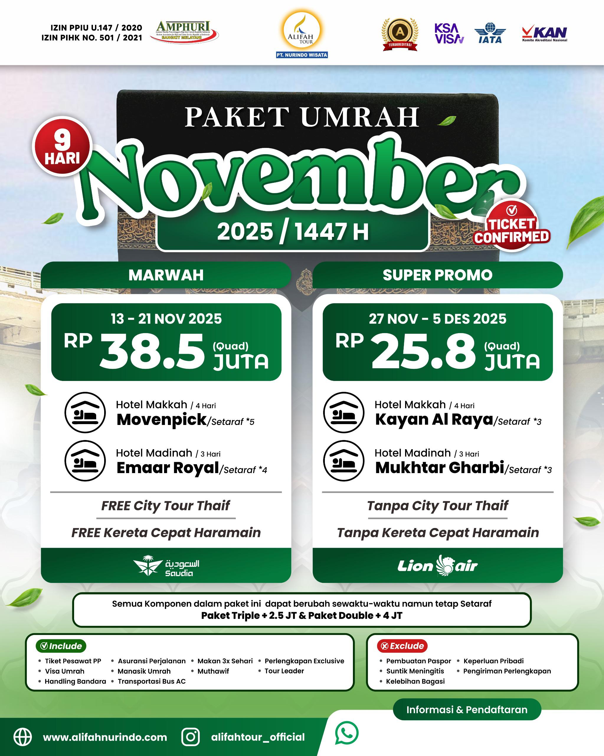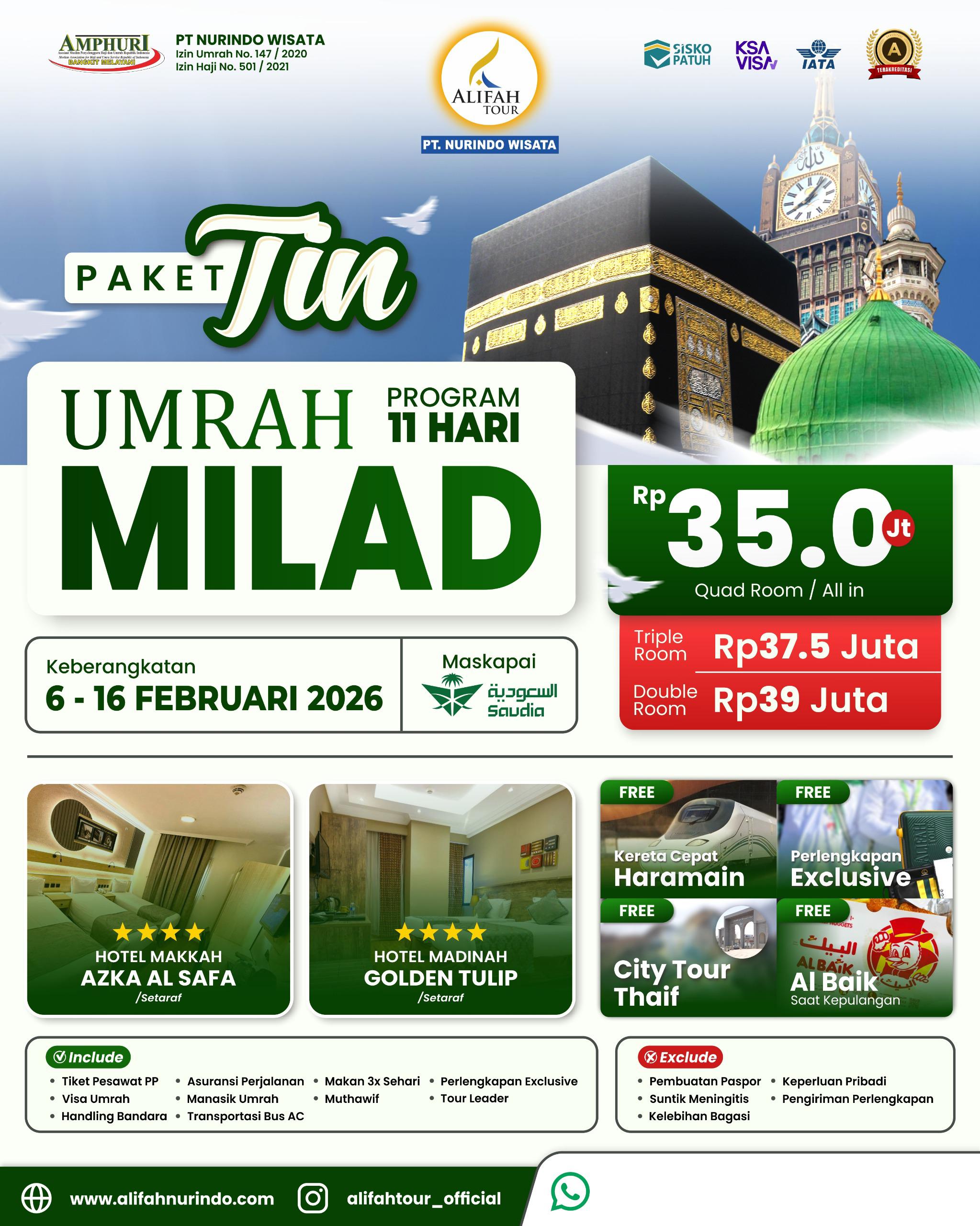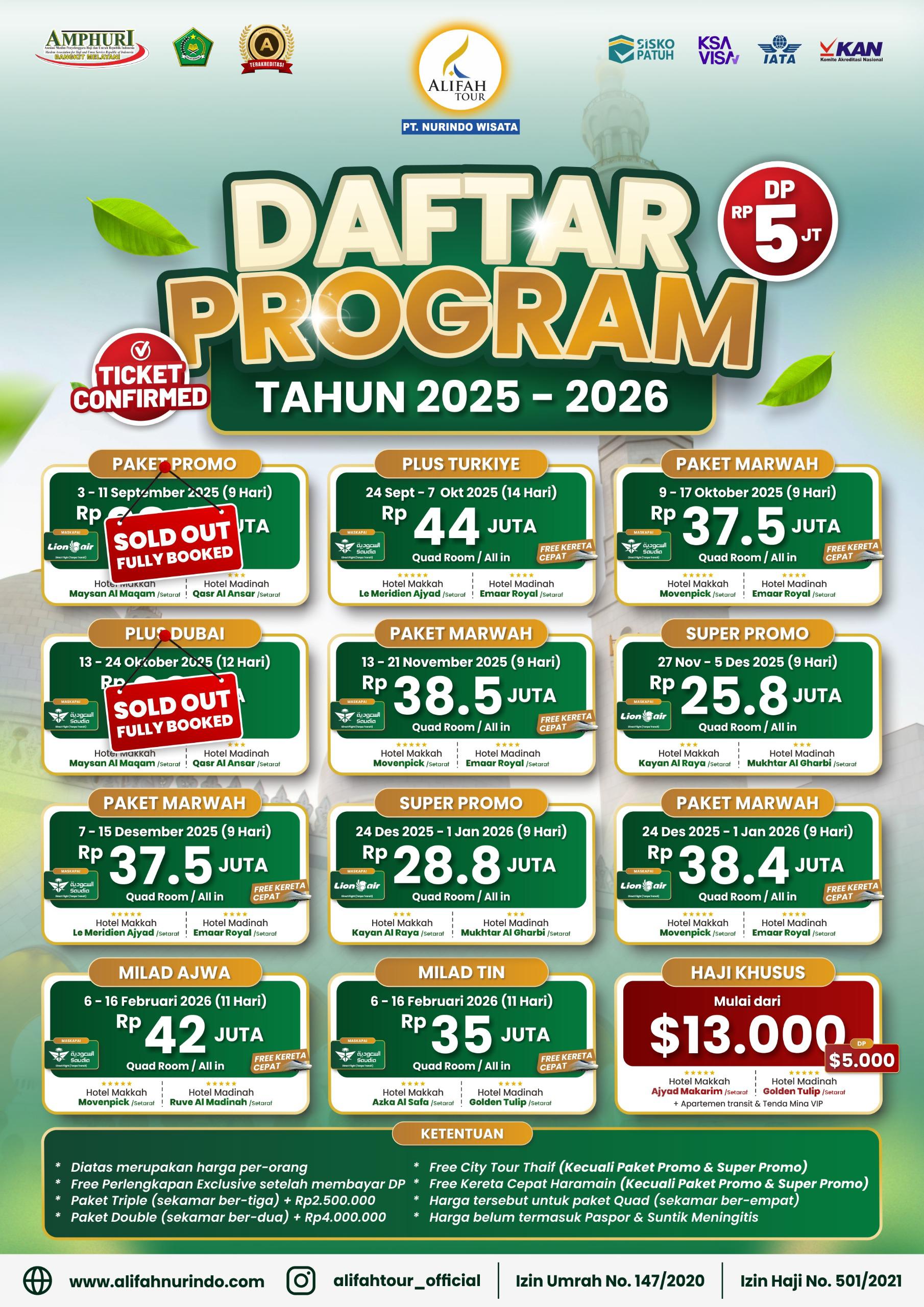 Alifah Tour adalah merek dagang dari PT. Nurindo Wisata, biro perjalanan umroh dan haji yang berizin resmi Kementerian Agama. Berdomisili di Bekasi, kami telah melayani ribuan jamaah sejak berdiri, dengan komitmen memberikan pelayanan ibadah yang amanah dan profesional.